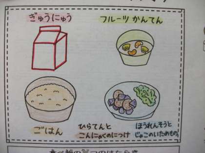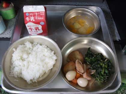 6/16 今日の給食 公開日 2015/06/16 更新日 2015/06/16 今日の給食 今日の給食は,「フルーツかんてん」「ひらてんと こんにゃくのにつけ」「ほうれんそうと じゃこのいためもの」「牛乳」「ごはん」でした。
