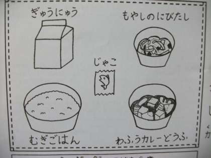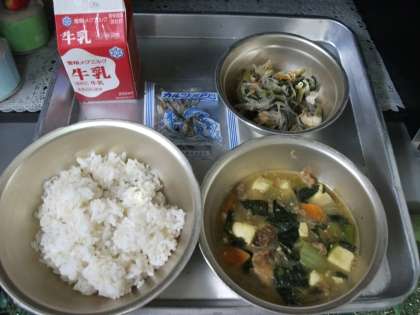 今日の給食は,「もやしのにびたし」「和風 カレーどうふ」「じゃこ」「むぎごはん」「ぎゅうにゅう」でした。