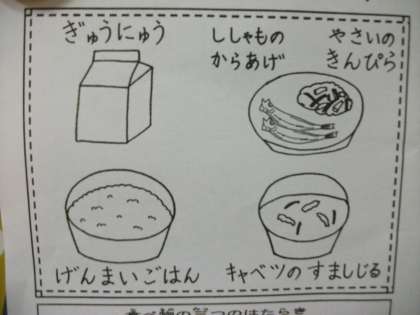 今日の給食は,「ししゃものからあげ」「やさいのきんぴら」「キャベツのすましじる」「げんまいごはん」「ぎゅうにゅう」でした。