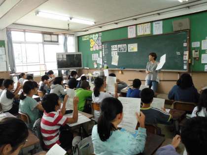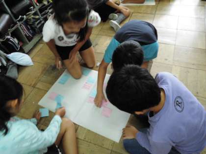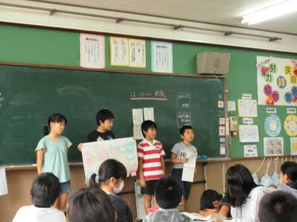 今日,エコライフチャレンジのふり返り学習をしました。まず最初に,夏休み前と比べてどれだけエコライフを送ることができるようになったのか,診断書にしていただきました。「夏休み前よりずいぶんできるようになったな」「夏休み前と変わらないな」など,自分の診断書を見て口々につぶやいていた子どもたちでした。次に,「できるたこと」「できなかったこと」を付箋に書き,友達と交流し合いました。その後,それをもとにグループで話し合い,グループのエコライフ目標を考えました。そして,全体の前で発表しました。「家族とエコライフについて話し合う機会を多く持ちたい」そのために,ご飯を食べるときに積極的にエコの話題を出していくようにします。「エコマークのついている商品を買うようにする」そのために,必ずエコマークがないか見るようにします。また,お家の人にも,買う前にエコマークをがあるか見てからかうように伝えていきたいです。各グループとも,目標だけでなくその目標を達成するためにどうしたらよいのかについても,しっかりと考えることができました。
