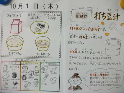 給食で「打ち豆」を使われるのは初めてです。打ち豆は,大豆を水につけてやわらかくしたものを,石うすの上にのせて,木づちでたたき,平たくつぶして乾燥させたものらしいです。