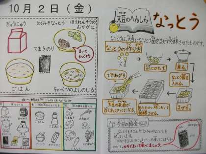 今日の給食は「にくみそなっとう」「ほうれんそうの おかかに」「キャベツの よしのじる」「てまきのり」「ぎゅうにゅう」「ごはん」でした。