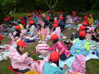 写真左の蟻地獄でも、滑ったり走ったり、他校のお友達とも一緒に仲良く楽しんでいました。あいにくの通り雨もありましたが、おいしいお弁当も緑の芝生でゆっくり食べることができ、大満足の一日でした。遊び疲れて、帰りのバスではぐっすり眠ってしまう子もいました。
