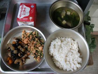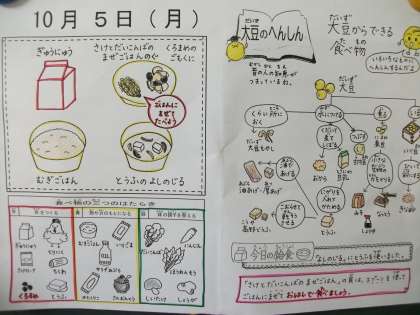 10/5 今日の給食 公開日 2015/10/05 更新日 2015/10/05 今日の給食 今日の給食は「さけと だいこんばの まぜごはんのぐ」「くろまめの ごもくに」「とうふの よしのじる」「ぎゅうにゅう」「むぎごはん」でした。