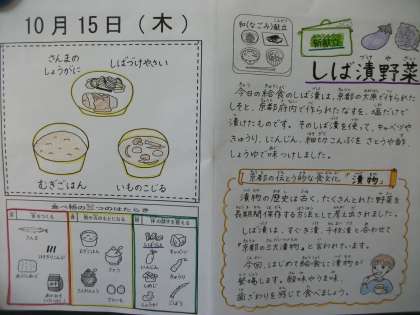 今日の給食は「さんまのしょうがに」「しばづけやさい」「いものこじる」「むぎごはん」でした。