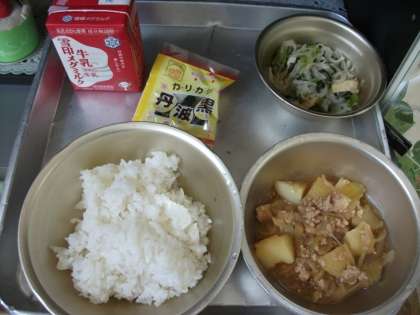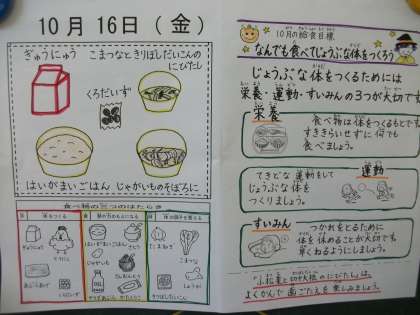 10/16 今日の給食 公開日 2015/10/16 更新日 2015/10/16 今日の給食 今日の給食は「こまつなと きりぼしだいこんの にびたし」「じゃがいもの そぼろに」「くろだいず」「ぎゅうにゅう」「はいがまいごはん」でした。
