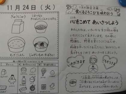 11/24 今日の給食 公開日 2015/11/24 更新日 2015/11/24 今日の給食 今日の給食は「こまつなと きりぼしだいこんの にびたし」「じゃがいもの そぼろに」「ぎゅうにゅう」「むぎごはん」でした。