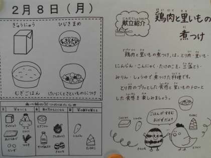 今日の給食は「ひじきまめ」「けいにくと さといもの につけ」「ぎゅうにゅう」「むぎごはん」でした。