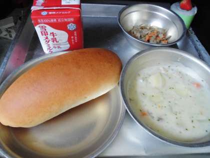 今日の給食は「ごぼうのソテー」「じゃがいものクリームシチュー」「ぎゅうにゅう」「あじつけコッペパン」でした。