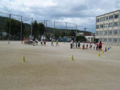 運動会のリレー練習が,給食準備時間を使って運動場で行われています。低学年は,1・2年が半周し,3年が一周します。4色対抗で違うクラスや学年の人にバトンを渡すのは,低学年の子どもにとっては難しいことです。練習時にしっかりと覚えさせる必要があります。入場練習,スタート位置の確認,走ってバトンの受け渡し…。