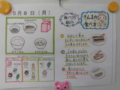 今日の給食は「麦ごはん,大根葉の炒めもの,さんまの変わり煮,若竹汁,牛乳」でした
