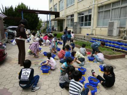 それぞれの教室で,土の入れ方,種を入れる穴のあけ方などについて先生から話を聞いて,いよいよ外へ。