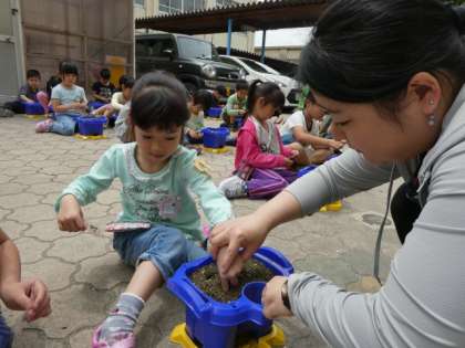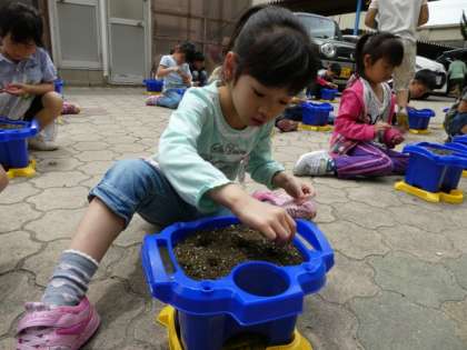 自分の植木鉢に注意深く土を入れ,先生と一緒に指で土に穴をあけました。