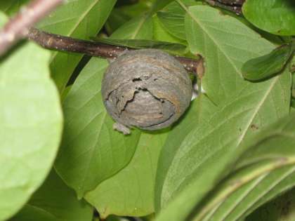 先週の金曜日に東門を南に行った所のサルスベリの木にハチの巣があることを用務員さんから報告を受けました。子ども達が帰ってから取り除こうと思っていましたが,ばたばたしていてできませんでした。それで,今朝,殺虫剤と虫取り網を手に退治に向かいました。アシナガバチが巣の周りにいました。殺虫剤を先に吹きかけ,成虫がポトンポトンと下に落ちてから,巣を取り除きました。ハチにはかわいそうなことをしましたが,子ども達が刺されてからでは遅いので,雨上がりに行いました。