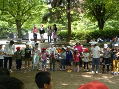 5月12日(金)山科区の育成学級全体の行事,「なかよし会」が東野公園でありました。新しいお友だちの紹介の後,猛獣狩り,貨物列車のゲーム,おおきくなるってのダンスをし,次は小グループごとに分かれてようかい体操,どんじゃんけんをしました。