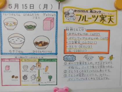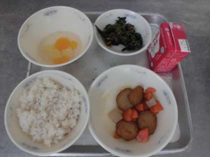 今日の給食は「麦ごはん,平天の煮つけ,ほうれん草の胡麻煮,フルーツ寒天,牛乳」でした。