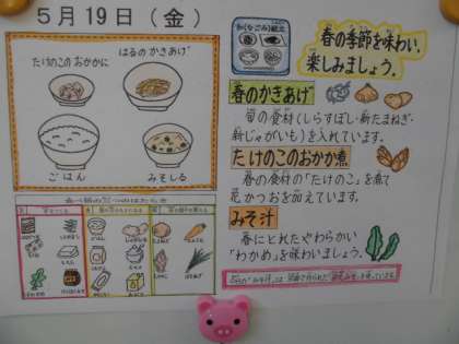 今日の給食は「ごはん,みそ汁,筍のおかか煮,春のかき揚げ」でした。和(なごみ)献立でした。
