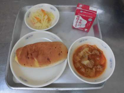 今日の給食は「チーズコッペパン,じゃがいものソテー,ミートボールとキャベツのトマト煮,牛乳」でした。