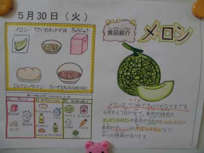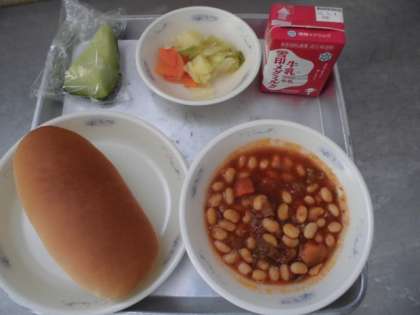 今日の給食は「ミルクコッペパン,大豆と牛肉のトマト煮,野菜のホットマリネ,牛乳,メロン」でした。