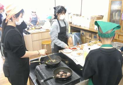 今回の調理実習では、3種類のメニューの中から1種類を選び班で協力して作りました。栄養バランスについて学んだ後だったこともあり、赤黄緑の話が班の中であったり、色合いや配膳場所なども意識したりしながら楽しく調理ができました。