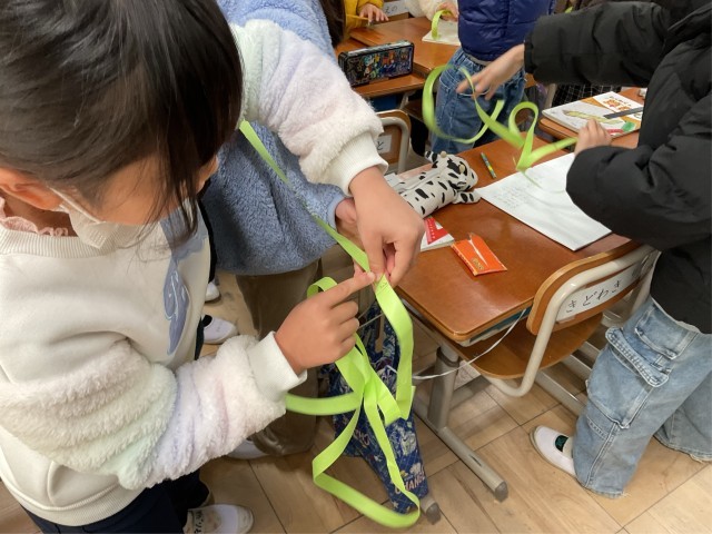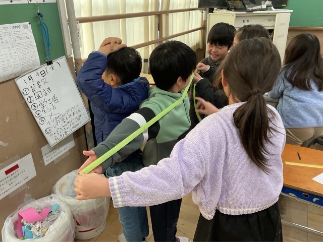 算数では,100㎝をこえる長さを学習しています。まずは,腕の長さを図る活動をしました。30㎝ものさしでは,測ることができず苦戦している姿が見られました。