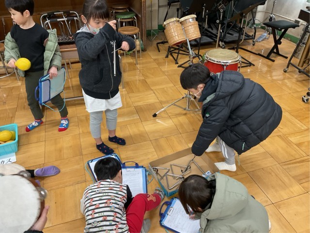 音楽の授業で様々な楽器を鳴らし、どんな音が奏でられるかを聴きました。すずは「シャンシャン」、ウッドブロックは「キッコカッコ」などたくさんの表現をしていました。