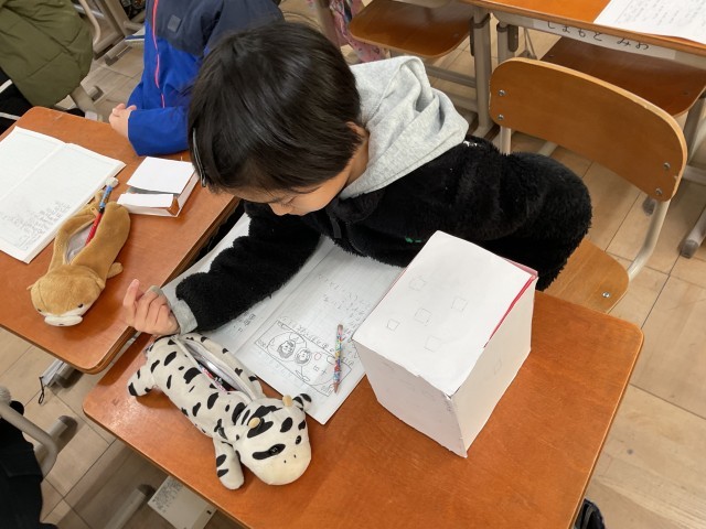 算数では、「はこの形」を学習しています。まずは、自分が持ってきた箱を通して、面の形や数について考えました。
