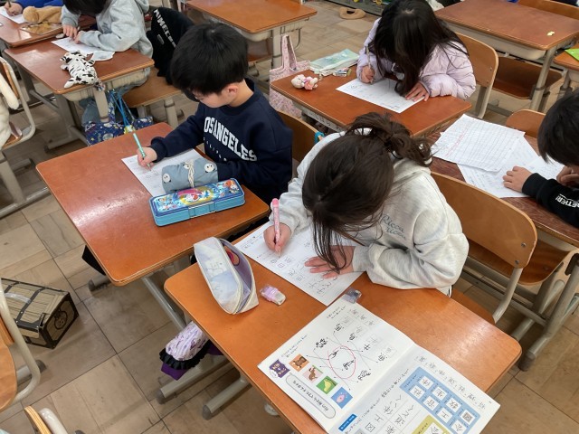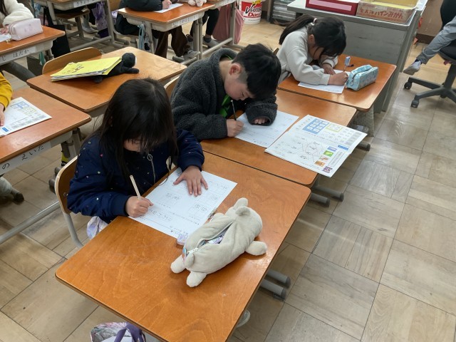 正しい姿勢で、マスを意識して字を書きました!意識して書くと、綺麗な字が書けて自分でもびっくりしましたね!