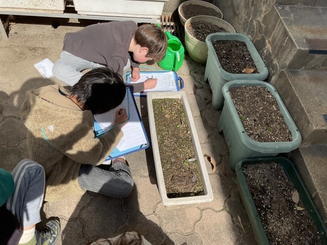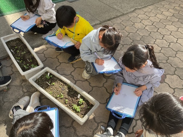 ハツカダイコンの観察に行きました。少しずつ育ってきましたね!