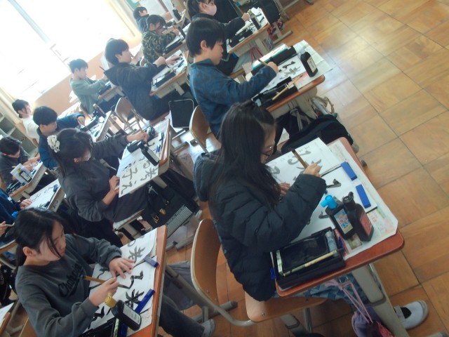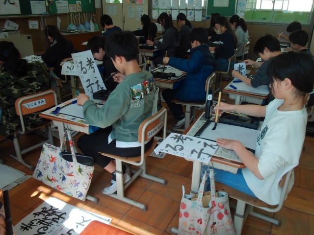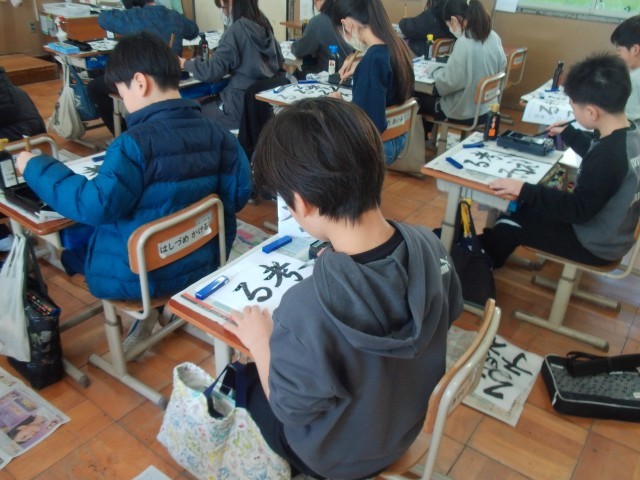 3月12日 5年生 書写「学習のまとめ」 公開日 2026/03/13 更新日 2026/03/12 5年生 毛筆書写の学習のまとめでした。お手本をよく見て自分のめあてに合わせて練習を重ね、作品を仕上げました。題字の通り自分のことだけでなく、相手のことも「考える子」をぜひ目指してください。