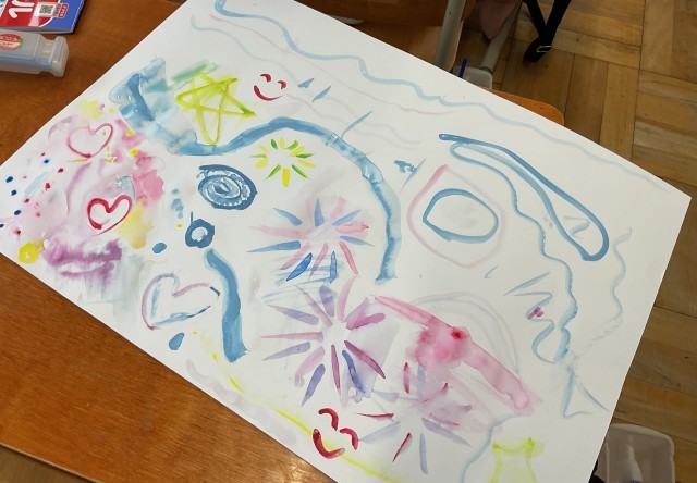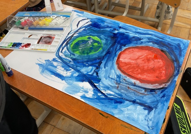 【3年】【図工】絵のぐ+水+ふで=いいかんじ! 公開日 2026/04/15 更新日 2026/04/15 3年生 図画工作科では、『絵のぐ+水+ふで=いい感じ!』の学習をしました。絵の具の特性をいかして、線や形や色で、気持ちをあらわしました。