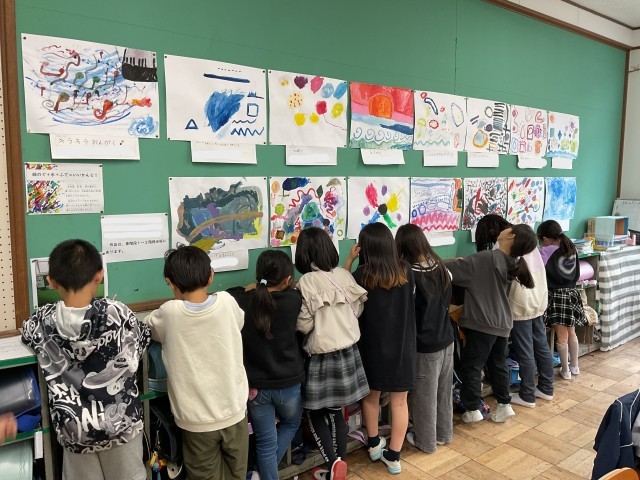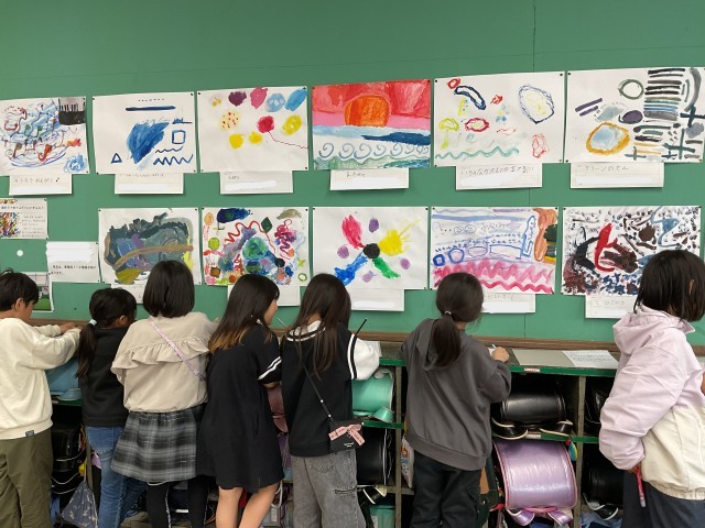 『絵のぐ+水+ふで=いいかんじ!』の学習でかいた絵の鑑賞をしました。色や形、ぬり方、水やふでの使い方を中心に友だちの作品のいいところをみつけ、文章に書き表しました。そのあと、書いた文章を発表したのですが、聞いた感想を伝えることをしている子もいて、和やかな雰囲気で学習することができました。