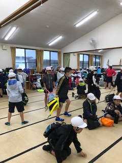 活動の本拠地となる「90畳」の部屋を紹介します。とってもとっても広い部屋なので子どもたちも大はしゃぎです。他に「60畳」の部屋もありますが、そちらには桃山小が使います。今日は女子が「90畳」に泊まり、男子はバンガローに泊まります。明日は男子と女子で交たいして泊まります。
