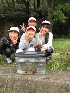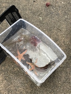 子どもたちは「カゴ漁」の獲物をうれしそうにのぞき込んでいます。カサゴやハゼ、ベラやゴンズイ、ヒトデなどたくさんの海の生物が捕れたようです。普段できない体験に子どもたちは大喜びです。