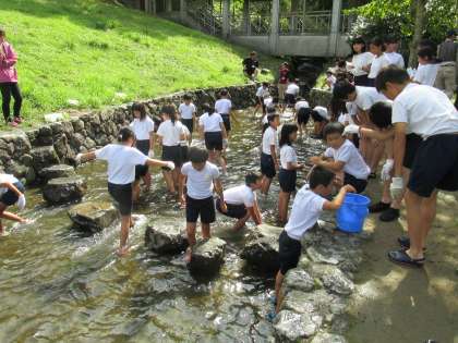 少し魚の苦手な人も,グループで協力して魚を採ってました。