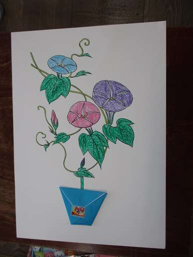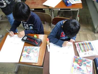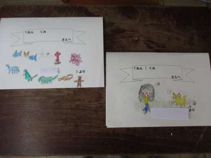 2年生は,4月25日に予定している1年生との「学校たんけん」に向けて,招待状を作りました。自分たちが1年生の時に育てた朝顔から収穫した種を折り紙で作った植木鉢に入れて招待状に貼りました。表紙には自由に絵を描いて,かわいい招待状が出来上がりました。