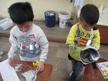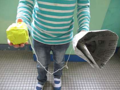 2年生は,1年生に招待状を渡すときにプレゼントするけん玉も作りました。新聞紙とたこ糸を使って作りました。1年生が喜んで遊んでくれるといいですね。
