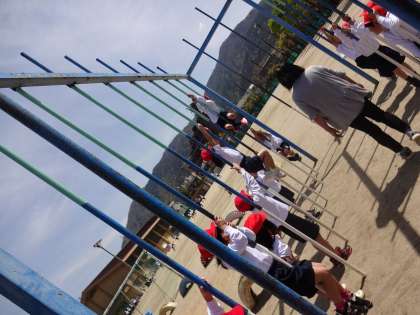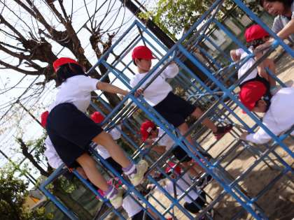 4月18日(木)の3時間目に1年生は体育の学習で遊具を使いました。一番大きな総合遊具はまだ使えませんが,ジャングルジムやのぼり棒,うんていを使って楽しみました。
