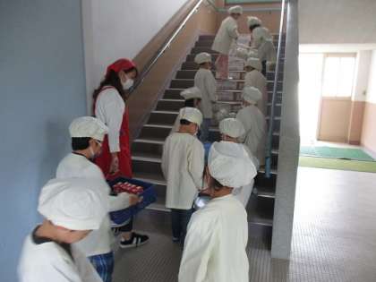 1年生が給食の準備をしていました。エプロンに着替えて手を洗い,2列に並んで給食室に行きます。給食調理員さんに届く声で「いただきます。」とあいさつをして給食室に入ります。