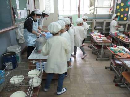 教室では,先生がよそったおかずやご飯を慎重に配ります。1週間の給食当番お疲れ様でした。