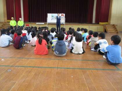 4月19日(金)に1年生の交通安全教室がありました。山科警察署の方と小野学区交通安全対策協議会の方に来ていただき,安全な道の歩き方や横断歩道のわたり方について教えていただきました。