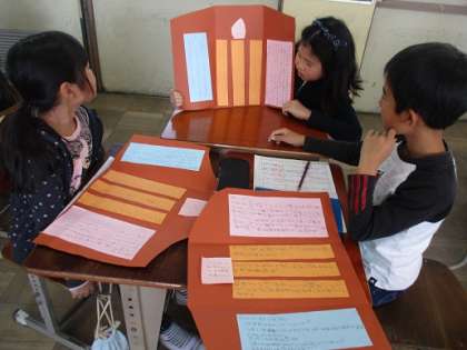 あまんきみこの「白いぼうし」の学習をした後に,同じ作者が書いた「山ねこおことわり」を読んで作った紹介人形を見せ合いながら,グループで交流をしていました。