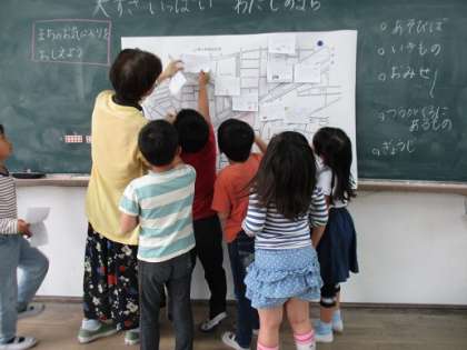 2年生は生活科の学習で,小野の町のお気に入りの場所を紹介するカードを書きました。カードは拡大した校区地図に貼り,お互いのお気に入りの場所がわかるようにしました。