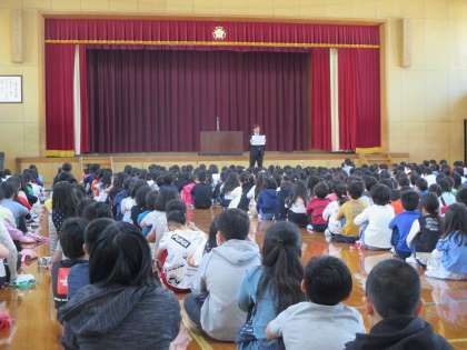 憲法朝会では、校長先生から一人一人が幸せに暮らせる社会を実現していくための日本の大切なきまりである「日本国憲法」についてお話していただきました。