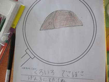 「色は茶色っぽいね。」「はしに穴があいているね。」「みかんの形みたい。」と気がついたことを文章と絵で丁寧に表現していました。
