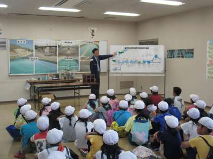 最初に,浄水場の方から水がどこから来て,浄水場でどのようにしてきれいな水になり各家庭に送られていくのかについてのお話を聞きました。