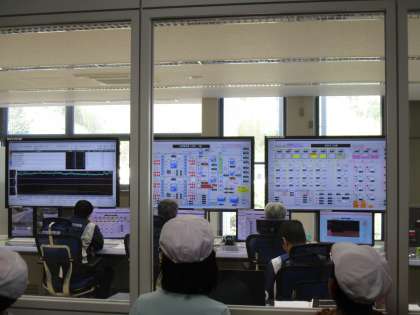 その後,実際に浄水場の様子を見学しました。2枚目の写真は急速ろ過池を見ているところです。3枚目の写真は中央管理室の様子です。