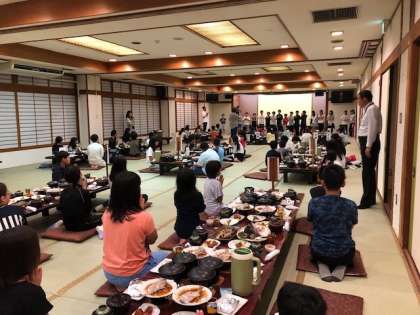 旅館「美舟」に到着した子どもたちは入館式を行い,一晩お世話になる旅館の方にご挨拶をしました。それぞれの部屋で荷物を整理した後,大浴場での入浴と買物をしました。