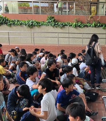 リトルワールドでの世界旅行から帰って来て,集合した子どもたちの様子です。暑い中でしたが,いろいろな国の文化にふれることができたと思います。お土産話を聞くのが楽しみです。