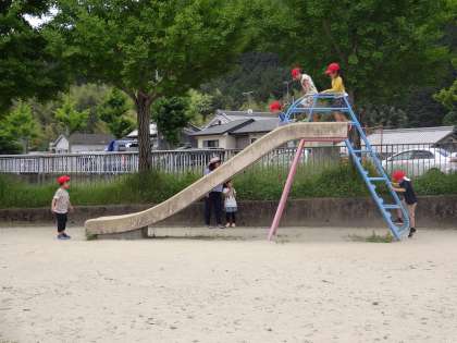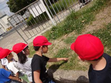 5月17日(金)の3時間目に生活科の単元で春の植物や生き物を探しに風呂尻公園へ行きました。てんとう虫やしろつめ草などを見つけることができました。たくさん春を見つけたので,少しの時間遊具で遊びました。とても暑かったのですが,元気よく活動することができました。